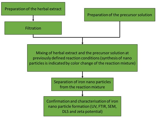 Batch synthesis is considered to be the most efficient and environmentally friendly procedure for synthesis of iron nanoparticles. Since the whole synthesis is actually performed in one beaker, glass, pot or reactor, it is often referred to as “one-pot” synthesis. A schematic diagram of the process is shown in Figure 2. Moreover, in comparison to synthesis using bacteria and fungi, it is considered to be much simpler since the step where bacterial and fungal biomass has to be synthesized and maintained under aseptic conditions [62] is not present, and preparation of herbal extracts is much simpler.