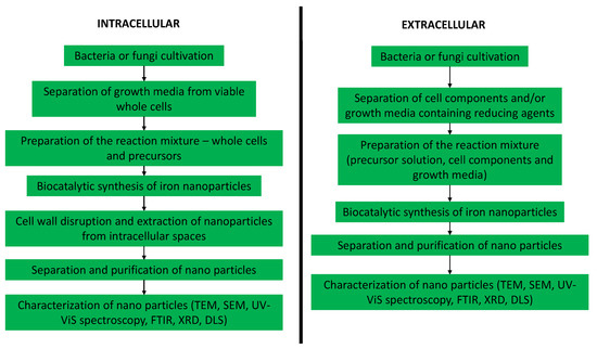 Batch synthesis of iron nanoparticles using bacteria and fungi is also described in the literature as a sustainable, eco-friendly, adaptable and diverse method [31]. In comparison to synthesis that involves plant extracts, the procedure using fungi and bacteria is considered to be more complicated, mainly due to the fact that the biomass has to be grown and sustained prior to synthesis of iron nanoparticles, and the work has to be completed in aseptic conditions. Furthermore, the synthesis mechanisms can be intra- or extracellular, and, if the mechanisms are intracellular, there is an extra step in the separation of the iron nanoparticles: they first have to be excreted from the intracellular space to be further purified and used. In extracellular synthesis, metal ions are reduced to nanoparticles by microbial enzymes and proteins, bacterial or fungal cell wall components or organic molecules present in the culture medium. The intracellular process is connected to synthesis on the microbial wall; namely, the microbial wall contains carboxyl groups that are electrostatically charged and attract metal precursor ions that then pass the cell wall and enter the cell, where they are reduced by intracellular proteins and cofactors to nanoparticles [103]. Similar to biosynthesis using plant extracts, process conditions such as temperature, pH, biomass and others affect synthesis of iron nanoparticles, including the morphology, particle size distribution and yield of the synthesis.