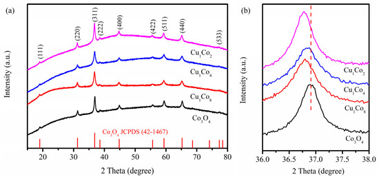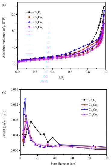 - Fan, L.; Li, M.; Zhang, C.; Ismail, A.; Hu, B.; Zhu, Y. Effect of Cu/Co ratio in CuaCo1−aOx (a = 0.1, 0.2, 0.4, 0.6) flower structure on its surface properties and catalytic performance for toluene oxidation. J. Colloid Interf. Sci. 2021, 599, 404–415. [Google Scholar] [CrossRef]