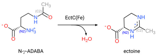 Ectoine synthase (EctC) is an enzyme from the cupin protein superfamily [1,2,3,4]. It is found in many organisms from the domains of Bacteria and Archaea, and even in some eukaryotes [3,4,5,6], with the most profound biochemical studies carried out for the orthologues from psychrophilic Sphingopyxis alaskensis [2] and thermophilic Paenibacillus lautus [1]. The enzyme catalyses the ultimate step of the ectoine biosynthesis pathway at an iron ion in its active site, which is the elimination of water from the substrate N-γ-acetyl-L-2,4-diaminobutyric acid (N-γ-ADABA) to affect ring closure (Figure 1) [3,4]. The reaction product is ectoine, a kosmotropic compound known for its cytoprotective, inflammatory-reducing, and moisturising properties [3,4,7,8,9,10,11,12]. It is synthesised by cells facing hyperosmotic stress in substantial amounts, up to 2-molar concentrations [13], which are exploited for biotechnological ectoine production [14,15,16,17,18,19]. Ectoine protects the cells from drying out by its osmotic properties [3,4] and additionally provides a protective hydration shield around macromolecules, saving them from denaturation [10,11,12]. Thanks to these properties, ectoine is already a popular ingredient in many pharmaceutical products used for the treatment of eye irritation [20,21], sore throat [22], or even inflammatory skin diseases [23].