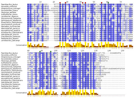 Multiple sequence alignment (MSA) of randomly selected EctC protein sequences from the UniProt database [25], obtained with the Clustal Omega programme [26] and visualised with JalView [27]. The MSA result is coloured according to the amino acid conservation: from the most conserved residues (dark blue) to the least conserved (white). Red dots indicate the residues participating in substrate binding, while green dots indicate the metal-binding amino acids. Below the MSA is the conservation section prepared with JalView, which scales from 0 (deep brown) to 10 (bright yellow) the conservation of physio-chemical properties in the MSA.
