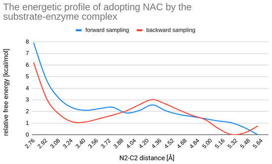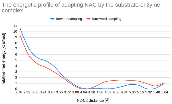 Since once again no NAC state was observed during the unconstrained MD, the potential mean force calculations with umbrella sampling for the C2-N2 distance were conducted. Most relevantly, no energy minimum corresponding to a NAC state (~3.4 Å C2-N2 distance) was observed on the PMF profile for the model with the Trp21-B conformation (Figure 10). Moreover, forcing the C2 and N2 atoms to adopt distances below 4.0 Å resulted in a gradual increase in the energy, which might suggest that the Trp21-B conformation blocks the substrate from adopting the NAC state.
