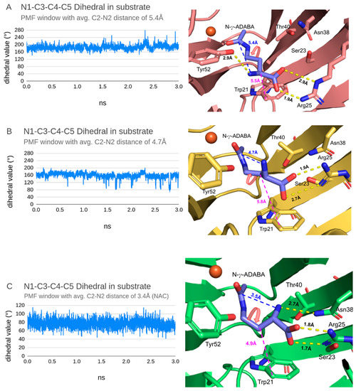 Looking at the structural differences between these three geometries, it is noticeable that in the NAC conformation, the N-γ-ADABA carboxyl group forms two direct, strong (as judged based on the H-X distance) hydrogen bonds with Arg25 and the alpha-amino group of the substrate forms one weak hydrogen bond with Asn38 (Figure 6 right bottom). Furthermore, the indole ring of Trp21 is close to the C4 carbon atom of N-γ-ADABA (~4.2 Å) and can interact with the substrate. In the geometry representing the maximum on the PMF profile, the carboxyl group of N-γ-ADABA forms just one strong hydrogen bond with Arg25, the other one being much weaker (Figure 6 right middle). Apart from that, no other hydrogen bonds were observed and the Trp21 indole ring is noticeably farther away from C4 (~5.8 Å). Finally, in the structure harbouring an extended N-γ-ADABA conformation, the carboxyl group of the substrate forms one strong and one weak hydrogen bond with Arg25, which is oriented laterally towards the substrate. Another hydrogen bond is formed between Tyr52 and the alpha-amino group of the substrate, and the indole ring of Trp21 is ~5.5 Å away from the substrate C4 carbon (Figure 6 right top). In all three geometries, Trp21 has the same conformation, i.e., Trp21-A (Figure 2C), which is coherent with the observation from the unconstrained MD analysis that it does not adopt the Trp21-B conformation.