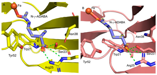 Similar to the case of unconstrained MD for the 4-coordinate Fe2+ model featuring Trp21 in the Trp21-A conformation, no NAC state of the substrate (C2-N2 distance <3.6 Å), was observed in MD simulations with the Trp21-B conformation (Figure S4 bottom). Notably, with EctC in the Trp21-B conformation, the NAC state did not even occur in sporadic, short-lived events. Average C2-N2 distances in the EctC dimer were 4.43 Å for the substrate bonded to monomer 1 and 4.49 Å for the substrate in monomer 2. Even though both average values of C2-N2 are smaller than those in the model with the Trp21-A conformation (Figure S4 top), this does not translate to achieving the NAC state. Furthermore, no change in the conformation of Trp21 was observed, as monitored by the value of the Cα-Cβ-Cγ-Nε dihedral (Figure S10 left), although the dihedral values in general fluctuated more significantly than for the analogous model with the Trp21-A conformation (Figure S5 left), suggesting lower stability of the side chain. Clustering the MD geometries based on heavy atom positions of N-γ-ADABA, Trp21, Arg25, Asn38 and Tyr52, and comparing the centroids of the largest clusters (covering 94% and 81% of the MD trajectory, respectively), shows that the carboxyl group of N-γ-ADABA forms two hydrogen bonds with Arg25 and one with Ser23 in both monomers (Figure 9A,B). No other hydrogen bonds between the substrate and amino acids are present, and the indole ring of Trp21 is near atoms C3 and C4 of the substrate (4.0 Å) in both monomers.