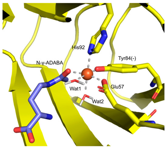 Results of previous experimental studies indicate that ectoine synthase is a metal dependent enzyme [1,2]. Interestingly, the metal binding motifs found in EctC sequences are different from those conserved among cupin proteins (Figure 3). The first difference is that the metal ion in the EctC is coordinated in a different manner. Usually, cupin proteins coordinate a metal ion via three conserved histidines and one glutamic acid and the typical metal binding motifs are: G(X)5HXH(X)3,4E(X)6G and G(X)5PXG(X)2H(X)3N [24]. In contrast, EctC binds the metal ion via three different amino acids: Glu57, Tyr84 and His92. Only the first one is conserved among EctC and other metal-dependent proteins from the cupin superfamily. The metal binding motifs of EctC are: G(X)5WY(X)4E(X)6G and G(X)6PG(X)2Y(X)3G(X)3H. To confirm the importance of Glu57, Tyr84 and His92 (Figure 2B) in catalysis, Widderich et al. [2] performed site-directed mutagenesis where they individually substituted all these amino acids with alanine residues. In all cases, the enzyme activity dropped significantly to levels of 9%, 23% and 10%, respectively, which indicated their active role in enzyme’s catalysis. Furthermore, the N-γ-ADABA molecule also contributes a ligand to coordinate the metal ion, via an oxygen atom of the carboxyl group [1] (Figure 2B). The metal binding residues are located on three β-strands: β6 (Glu57), β9 (Tyr84) and β10 (His92) and are highly conserved among ectoine synthases found in different organisms [1,2].