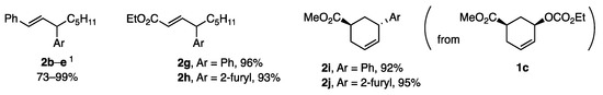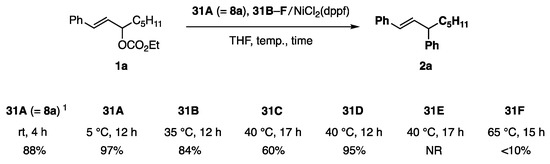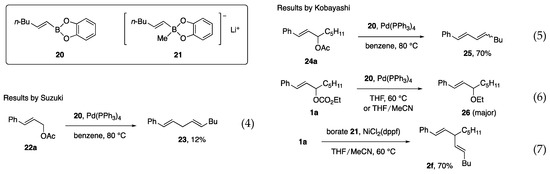 Before our investigation, the Pd-catalyzed reaction of primary allylic acetate 22a with boronate ester 20 was reported by Suzuki and Miyaura in their mechanistic study of the “Suzuki–Miyaura coupling reaction” (Scheme 3, Equation (4)) [5]. Due to the reactivity toward secondary acetates has not been reported, acetate 24a, and carbonate 1a were subjected to Pd-catalyzed reactions in our study. However, undesired diene 25 or Et ether 26 was produced (Equations (5) and (6)) [11]. In contrast, the reaction of 1a with borate 21 and a Ni catalyst proceeded smoothly to afford 2f with a 70% yield (Equation (7)).