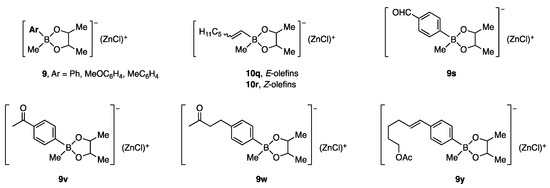 Under the reaction conditions used in entry 3 of Table 2, the zinc borates in Figure 2 underwent coupling reactions to give the products shown in Figure 3 in good to high yields. An anti-stereochemical course was established using cyclic substrates.
