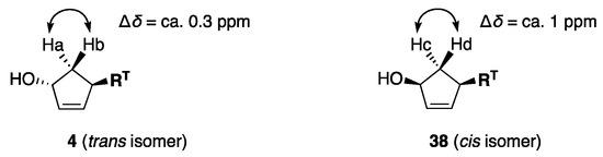 Substituents OH and RT sterically affect the chemical shifts of Ha and Hb in 4 and Hc and Hd in cis isomer 38 (Figure 4) [18]. For example, Ha in 4 is cis to OH and trans to RT, whereas Hb is arranged in the opposite direction. This relationship (one cis, one trans) between Ha and Hb results in a small chemical shift difference (Δδ) of ca. 0.3 ppm. On the other hand, Hc in 38 is trans to OH and RT, whereas Hd is cis to these substituents, resulting in a large Δδ of 1 ppm. In our study, the stereochemistry of 4 was inverted to produce isomer 38 by the Mitsunobu inversion, and the vicinal protons (Ha/Hb, Hc/Hd) in the 1H NMR spectra were easily found based on the large coupling constants of ca. 14 Hz.
