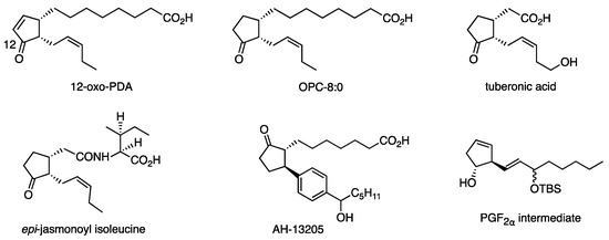 The combination of RMgX, CuX, and the solvent was further investigated to find aryl, alkenyl, and benzylic reagents. These protocols have been successfully used as key steps in the syntheses of plant hormones (such as 12-oxo-PDA and OPC-8:0 [34], tuberonic acid [35], isoleucine conjugate of epi-jasmonic acid [36]), AH-13205 (PG receptor agonist) [37], and PGF2α intermediates [38] (Figure 6). The ω side chain of Δ7-PGA1 methyl ester (43) (structure in Scheme 10) was installed to 3 with efficiency similar to that recorded with the borate [39].