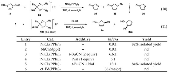 Based on the finding that the attachment of electron-donating Me groups to the diol ligand increased the nucleophilicity of borates (Scheme 6, 31A (=8a) vs. 31B), the Me ligand in 8a was replaced by the more electron-donating n-Bu. Indeed, the new phenylborate 10a transferred Ph to cyclopentenyl acetate 3 in the presence of NiCl2(PPh3)2 (Scheme 8, Equation (11), entry 1). However, a mixture of regioisomers 4a and 37a was produced at a 0.9:1 ratio. To solve this problem, catalysts, polar solvents, and inorganic salts were examined without any promising guidelines. Although NiCl2(dppf) did not change the product ratio (entry 2), t-BuCN and NaI favored the production of 4a (entries 3 and 4). Furthermore, the cooperative action between both additives resulted in a higher regioisomeric ratio of 13:1 (entry 5). In contrast, a Pd catalyst produced ketone 35 (entry 6).