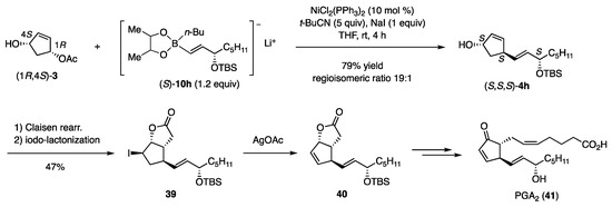 The coupling conditions disclosed in Table 3 were then applied to enantiomerically enriched (1R,4S)-3 and (S)-10h to afford (S,S,S)-4h in 79% yield with a regioisomeric ratio of 19:1 (Scheme 9) [13]. The product was transformed to iodolactone 39 through the Claisen rearrangement, followed by iodolactonization of the derived acid. Deiodination with AgOAc produced olefin 40, the intermediate in the synthesis of PGA2 (41) [19].