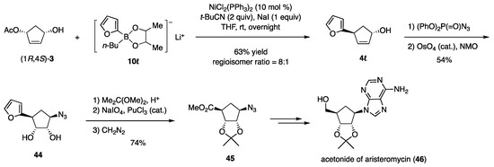 The furyl moiety as a precursor of CO2Me was installed to (1R,4S)-3 with furylborate 10ℓ (Scheme 11) [21]. The hydroxy group in the product 4ℓ was then replaced by N3 with inversion using (PhO)2P(=O)N3, and the furyl group was oxidatively cleaved to afford 45, which was transformed into the target 46 without difficulty.