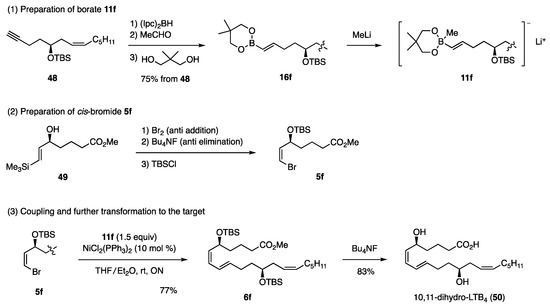 Based on the above findings for the synthesis of dienes, the necessary borate 11f and cis-bromide 5f were easily elucidated [23]. Among the existing methods for synthesizing borate 11f, the following method was selected based on the potential regio- and stereoselectivity (Scheme 12). The hydroboration of acetylene 48 with (Ipc)2BH (Ipc: diisopinocampheyl), followed by ligand exchange to EtO using MeCHO and transesterification, produced 16f, which upon reaction with MeLi afforded borate 11f. On the other hand, allylic alcohol 49 was prepared with high stereo- and enantioselectivity by the kinetic resolution using the Sharpless asymmetric epoxidation. Subsequently, 49 was converted to cis-bromide 5f [24]. The coupling reaction proceeded smoothly to afford 6f in 77% yield, and the subsequent desilylation of TBS with Bu4NF conveniently induced “formal hydrolysis” of the Me ester group to produce the target 50, which is an inflammatory mediator.