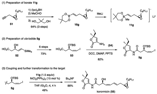 The title compound inhibits the growth of marine gram-negative bacteria. The planar structure of this compound was reported based on the NMR and mass spectral data. Consequently, four diastereomers were synthesized to determine the stereochemistry by comparing the [α]D values of the diastereomers with those published for natural korormicin. The synthesis of the diastereomer, which showed a close [α]D value to that of the natural one, is shown in Scheme 13 [25]. The necessary borate 11g and cis-iodide 5g, were synthesized through 51 and 52, respectively. Due to the structural specificity of 52 possessing the COOH group, the corresponding bromide could not be obtained. Instead, iodide 52 was transformed to 53 via iodolactonization. Acid 53 was then reacted with amine 54 under somewhat specific reaction conditions to afford amide 5g. The Ni-catalyzed coupling reaction of iodide 5g with borate 11g produced the TBS ether of korormicin, which upon desilylation afforded korormicin (55).