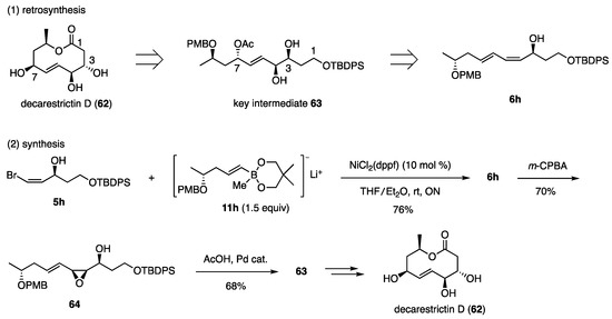 The same structural pattern was extracted from decarestrictin D (62), which exhibits inhibitory activity against HMG-CoA reductase. Based on the stereochemical relationship summarized in Scheme 14, dienyl alcohol 6h was designed as the precursor of the key intermediate 63 (Scheme 15) [26,27]. Coupling partners 5h and 11h were prepared using methods similar to those used for the synthesis of 10,11-dihydroxy-LTB4 (50) (Scheme 12). The use of cis-bromide 5h, which possesses a free hydroxy group, was a new case of the Ni-catalyzed coupling reactions. The reaction proceeded smoothly, requiring 1.5 equiv of 11h to produce 6h with a 76% yield. This result indicates that the borate was not affected by the free hydroxy group in 5h. The epoxidation of 6h with m-CPBA and subsequent Pd-catalyzed reaction with AcOH proceeded with high selectivity to afford the intermediate 63 with a 68% yield. Further transformation to decarestrictin D (62) was successful.