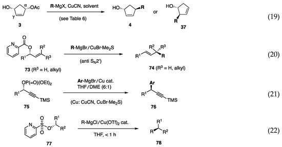 In the above study using borates, the development of alkyl borates for C–C bond formation was unsuccessful. Therefore, we focused on alkyl reagents derived from (alkyl)MgX and a copper salt and found that several combinations of (alkyl)MgX, CuCN, and solvent delivered an alkyl group to cyclopentenediol monoacetate 3 to afford either 4 or 37 with high regio- and stereoselectivity (Scheme 18, Equation (19)) [30]. Subsequently, aryl, alkenyl, and benzylic reagent systems were developed as described below. We also established allylic and propargylic substitutions on acyclic secondary carbons [Equations (20) and (21)]. Acyclic allylic substitution features the use of allylic picolinate 73 to yield the anti-SN2′ product 74 with regio- and stereoselectivity (Equation (20)) [31]. Propargylic substitution was realized using propargylic phosphate 75 and a Cu catalyst in THF/DME to produce 76 with high stereoselectivity (Equation (21)) [32]. In contrast to allylic and propargylic substrates, the substitution of secondary alkyl carbons was difficult because of the lack of reaction enhancers, such as allylic and propargylic unsaturation. Nevertheless, pyridinesulfonate 77 was invented for this purpose (Equation (22)) [33]. In the second part of this review, we briefly present the results of these reactions.