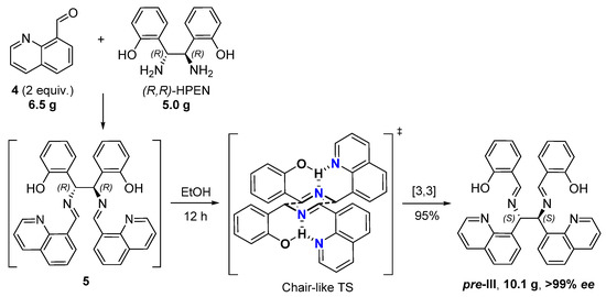 We synthesized novel C2-symmetric diimine pre-III by the asymmetric reaction of 8-quinoline carbaldehyde (4) (2 equiv.) with commercially available (1R,2R)-bis(ortho-hydroxyphenyl)ethane diamine ((R,R)-HPEN) accompanied by stereoselective diaza-Cope rearrangement [19,20,21] of the initially generated diimine 5 (Figure 2). The domino reaction was carried out in EtOH at ambient temperature over 12 h. Diastereo- and enantiomerically pure product pre-III was precipitated from the reaction mixture (yield 95%) and did not require further purification. The excellent stereoselectivity may be attributed to the formation of chair-like six-membered transition state (TS) with favorable pseudo-equatorial orientation of substituents stabilized by hydrogen bonds [22]. The reaction is readily scalable and allows practical asymmetric synthesis of more than 10 g of pre-III over a single experimental operation.