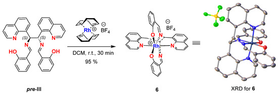 To determine the structure and absolute configuration of pre-III, we synthesized complex 6 of this ligand with Rh[(COD)2]BF4 by slow evaporation of CHCl3 from the binary solution of both components in this solvent (Figure 3). According to the X-ray diffraction (XRD) study, the obtained crystals of 6 had an octahedral configuration with a Rh atom coordinated with four nitrogen and two oxygen atoms at the apexes of the octahedron. The XRD data proved the (S)-configuration of both stereogenic centers in 6 (for details see SI), the assignment being highly reliable and taking into account the presence of Rh heavy metal in the complex [23].