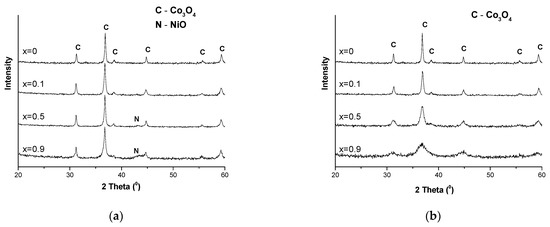 An increase in the Mg or Ni content leads to an increase in the lattice parameters and a decrease in the CSR (coherent scattering region) size, which is more pronounced in the case of Mg. On the X-ray diffraction patterns of Cs/Ni-Co (x = 0.5 and 0.9) samples, along with the peaks related to spinel, a reflection is additionally observed in the region of 2θ = 43.37, which refers to the NiO impurity phase. For Cs/Mg-Co samples, the formation of the magnesium oxide phase is not observed. The substitution with Mg or Ni leads also to an increase in SBET values of the samples (Table 1). In the case of substitution with Ni, the CSR size changes nonmonotonically with increasing the degree of substitution, as does SBET. This can be attributed to the fact that a part of the nickel is not a part of the spinel but exists in the NiO impurity phase, while the formation of a continuous series of homogeneous solid solutions for the Cs/Mg-Co samples may be proposed [21].