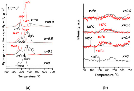 According to the O2-TPD data, the oxygen desorption occurs in two stages in a wide temperature range of 80–500 °C (Figure 2b). Considering the conditions of N2O decomposition in the SCR reactor, the low-temperature desorption peak is of the greatest interest. The initial temperature of O2 desorption () for Cs/Co3O4 is 150 °C. The substitution of cobalt cations with Ni or Mg cations reduces the initial desorption temperature () in substituted Cs/Ni-Co and Cs/Mg-Co samples (Table 2). The presence of Mg in the samples reduces () more than Ni. The amount of desorbed oxygen varies through the maximum for both series at (x = 0.1), but is more pronounced for Cs/Ni-Co. At low temperatures, the main contribution to oxygen desorption is made by weak physical forces, for which an important role is played by the electronic interaction of the surface atoms of the catalyst, including Mg or Ni modifiers. The lower electronegativity of magnesium makes it possible to subsidize the electron density and reduce the energy of oxygen desorption. However, it is shown that a greater amount of desorbed oxygen in the Cs/Ni-Co samples is observed at relatively lower SBET values than in the Cs/Mg-Co samples. This leads to the imperfection of the oxygen sublattice and the formation of structural defects on which weakly-bound oxygen species are adsorbed. It is possible that this is the effect of a larger amount of applied cesium in the Cs/Ni-Co series. The O2-TPD findings correlate with the H2-TPR observations.