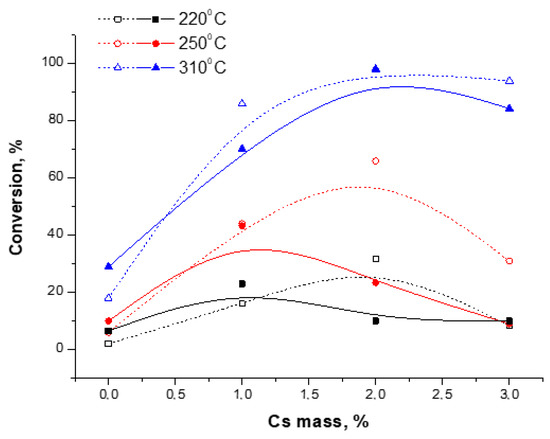 A study on the catalytic activity of Co spinel samples with a degree of substitution (x = 0.5) of Mg or Ni cations showed that when the cesium content varied from 0 to 3 wt%, samples containing 1–2 wt% Cs demonstrated high performance (Figure 3).
