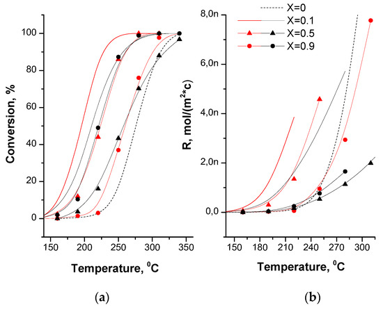 The half-transformation temperature (T50) for samples with the degree of substitution (x = 0.1) is minimal and amounts to 196 and 210 °C for Cs/Ni-Co and Cs/Mg-Co, respectively (Table 1). For unsubstituted cobalt spinel Co3O4, this value is maximal and amounts to 275 °C. High specific activity (the activity normalized per m2, the reaction rate) was demonstrated by Cs/Ni-Co (x = 0.1 and 0.5) and Cs/Mg-Co (x = 0.1) samples (Figure 4b). The Cs/Mg-Co sample with (x = 0.1) is inferior to the Cs/Ni-Co samples (x = 0.1 and 0.5) in the reaction rate and in the amount of desorbed oxygen referred to the surface area. The observed correlation indicates a significant effect of weakly bound surface oxygen in the catalysts on the reaction rate, which is consistent with the data on the rate-limiting stage of this reaction at low temperatures [4,5].