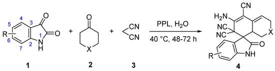 In this study, we investigated the synthesis of spirooxindoles from isatin, malononitrile and cycloketone substrates with lipase from porcine pancreatic lipase (PPL) in the presence of water to expand the study of non-natural enzymatic reactions and explore favorable biocatalytic synthesis. To the best of our knowledge, the synthesis of spirooxindole using a one-pot tandem process catalyzed via lipase in aqueous media has not been reported before (Figure 1).