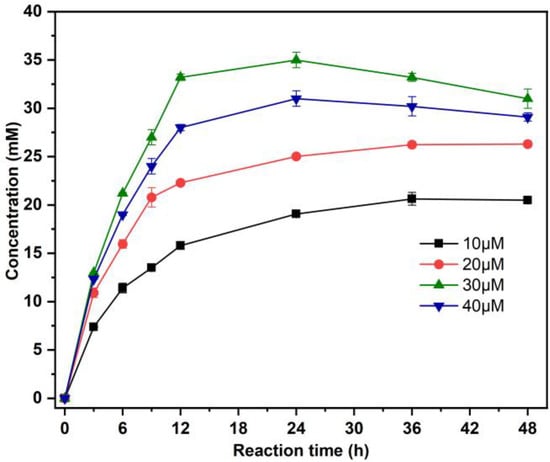 Effects of PeAAOx dosage on the oxidation of veratryl alcohol. (Reaction conditions: [PeAAOx] = 10, 20, 30 and 40 μM, [AaeUPO] = 2 μM, [veratryl alcohol] = 50 mM (pre-dissolved in acetonitrile), 30 °C, pH 7 and 500 rpm).