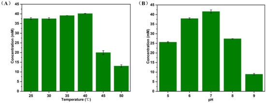 Factors influencing cascade catalytic oxidation of veratryl alcohol. (A) Temperature; (B) pH. (Reaction conditions: [PeAAOx] = 30 μM, [AaeUPO] = 2 μM, [veratryl alcohol] = 50 mM (pre-dissolved in acetonitrile), 500 rpm and 24 h).