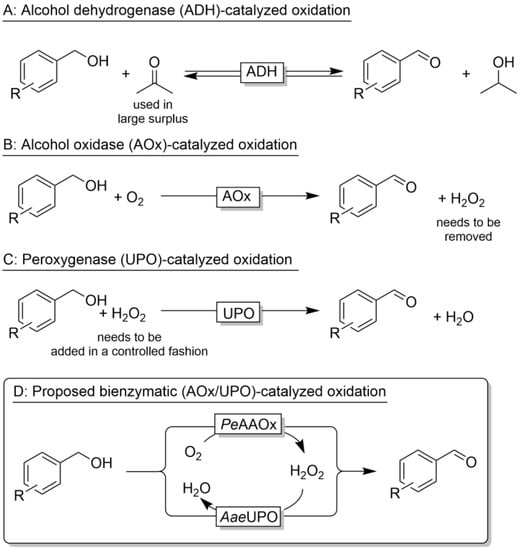Even more recently, so-called unspecific peroxygenases (UPOs) have been reported to mediate the H2O2-dependent oxidation of alcohols (Scheme 1C) []. Again, H2O2 challenges the robustness of the overall reaction, therefore necessitating controlled provision with H2O2 [,].