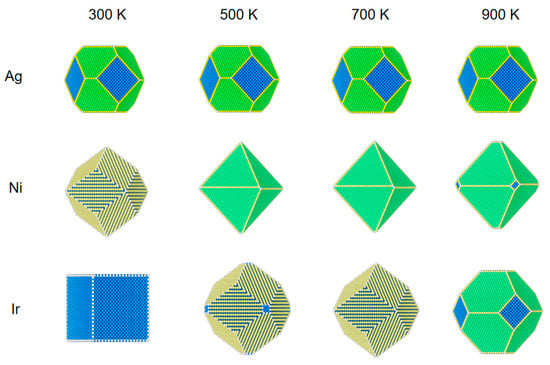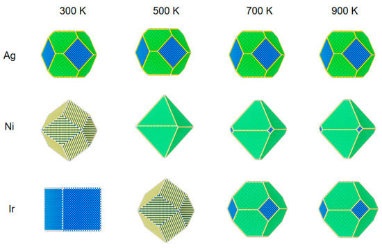 The structural evolution of 5 nm metal NPs (Ag, Ni, and Ir) at different temperatures and 1 Pa of CO. Blue is 100 surfaces, yellow is 110 surfaces, and green is 111 surfaces.
