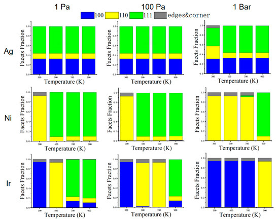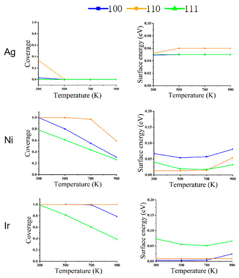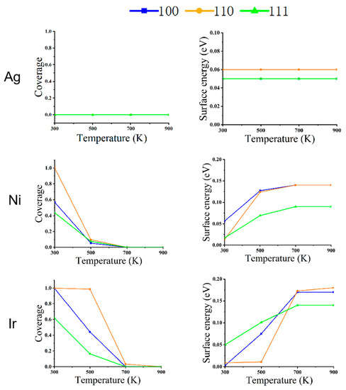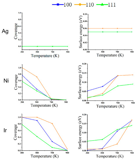 As can be seen from Figure 3, Ag NPs at a pressure of 1 bar CO and a temperature of 300 K are different from when the pressure is low (1 Pa) and at 100 Pa. At 300 K, CO coverage is 33% at (110) and 3% at (100). The fraction of (110) increases more rapidly than (100) and (110). Due to the high pressure, the Ni and Ir surfaces are more strongly adsorbed to CO, so the structures until 700 K of temperature are similar to those at 300 K. In particular, Ir NPs are still 100% CO coverage at 900 K (110). The surface of Ni also has adsorption that differs from the low-pressure case.