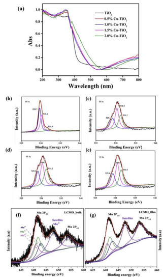 (a) UV-vis diffuse reflectance spectra of TiO2 samples with different Cu loadings, XPS spectra of O 1s on the surface of (b) TiO2, (c) 0.5% Cu-doped TiO2, (d) 1.5% Cu-TiO2, and (e) 2.0% Cu-doped TiO2 samples, and XPS spectra of Mn 2p core level of (f) LCMO bulk and (g) LCMO film [91,92].