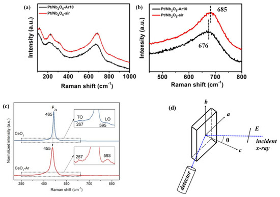 Raman spectroscopy was widely applied in studying various defects, such as OVs caused by ion doping and so on, because the characterization method was high-efficiency and sensitive to the structure and bond order of perovskites [93]. For example, the chemical coordination structures of Pt/Nb2O5-AR10 (PNO-A) and Pt/Nb2O5-air (PNO-a) were studied by Raman spectroscopy. The peaks after several times magnification are shown Figure 4a,b. It could be clearly seen that in PNO-A, the peak concentrated at 685 cm−1, while the peak of PNO-a shifted to 676 cm−1, which could generate more OVs under Ar reaction.