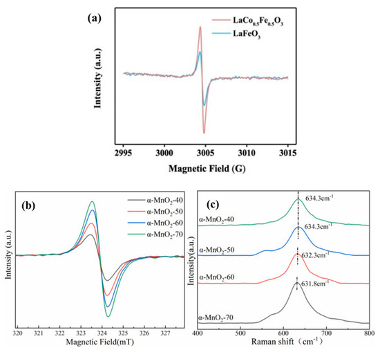 EPR was a kind of magnetic resonance technology that could be used to detect the unpaired electrons contained in atoms or molecules of matter qualitatively and quantitatively. Then, the structural properties of the surrounding environment could be explored. Jing et al. [98], respectively, synthesized LaFeO3 (LFO) and 3D micron globular LaCo0.5Fe0.5O3 (LCFO) by the hydrothermal method. Both of these perovskites were used to activate PMS to degrade BPA, and the electron spin resonance (ESR) spectra of the two were compared to detect OVs (Figure 5a). LCFO exhibited stronger signal intensities due to electron capture sites on OVs. The peak intensity was proportional to the concentration of OVs, which also indicated that there were more OVs in the LCFO material. OVs in LCFO could be increased by ion co-doping in a LFO structure, thereby enhancing the activation ability of PMS [99].