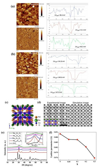 Topography and contact potential difference (CPD) images of as-prepared (a) BFO and (b) hydrogenated BFO (HB−180−2−8) nanoparticles on ITO surface measured by KPFM. The cross−se−tional line profiles of CPD are achieved along the lines indicated by numbers 1, 2, and 3 in CPD images and direct observation of oxygen vacancy channels in NdBaCo2O5.5 (NBCO5.5) double perovskite. (c) Schematic view of the structure of NBCO5.5. (d) ADF STEM and simulated images of NBCO5.5 taken in the [100] zone axis. (e) HAADF image of NBCO5.5 with the EDS elemental map of Nd, Ba, and Co. (f) XRD patterns of MnxZr1−xO2 catalysts [103,104,105].