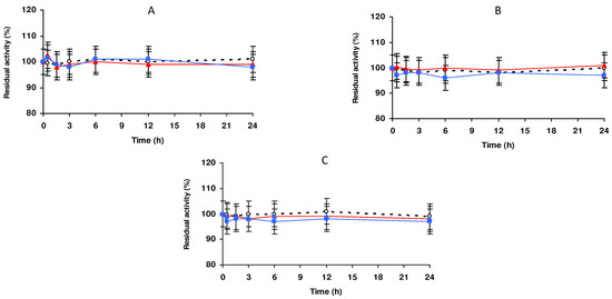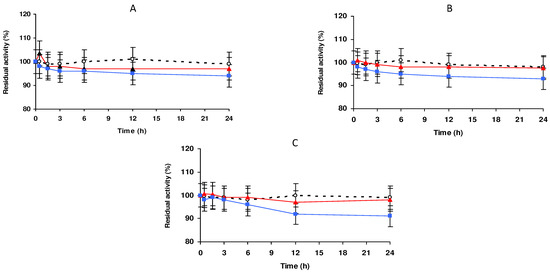 Effect of the pH in the immobilization courses of PGA on agarose-VS at 25 °C using 5 mM of the corresponding buffer. Data are shown as residual activity in %, considering 100% the initial activity. (A) Sodium acetate at pH 5.0, (B) sodium phosphate at pH 7.0, and (C) sodium carbonate at pH 9.0. Empty circles with dashed line: reference suspension. Red triangles: suspension. Blue squares: supernatant. Other specifications are described in the Methods Section.