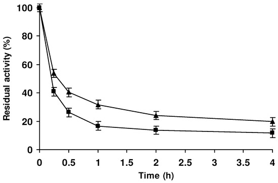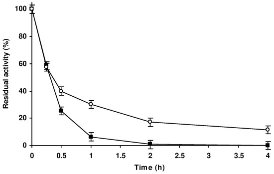 Thermal inactivation courses of soluble PGA in 50 mM of Tris HCl (solid squares) and Agarose-MANAE-VS-PGA immobilized at pH 7, incubated for 5 h at pH 10, and blocked with Gly (empty circles). Other details can be found in the Materials Section.