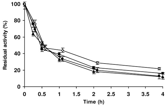 Effect of the incubation pH of the PGA biocatalyst on its thermal stability. Figure shows the thermal inactivation courses of PGA immobilized at pH 7 and incubated at different pH values (see legend of Table 3). Full triangles: pH 7.0. Full circles: pH 8.0. Full squares: pH 9.0. Empty rhombi: pH 10.0. Other specifications are described in the Methods Section.
