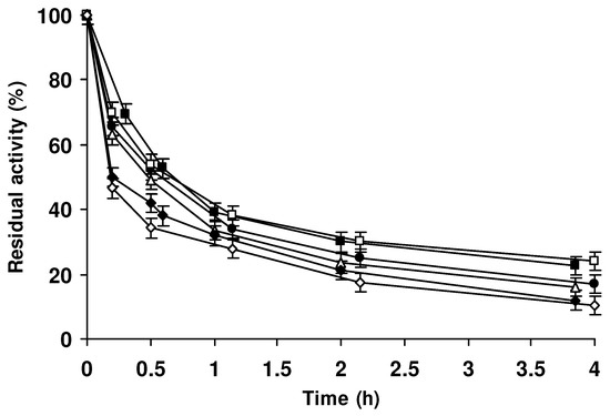 The different biocatalysts were inactivated by incubation in 50 mM of Tris-Cl at pH 8.0 in a water bath with the temperature set at 55 °C. Periodically, samples were taken, and their residual activities were determined using the NIPAB assay described above, considering the initial activity of the preparation as 100% and referencing the activity of the other samples to this initial value as a percentage.