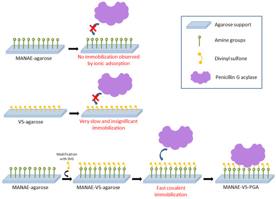 PGA immobilization strategy on heterofunctional MANAE-vinyl sulfone (VS) agarose beads. PGA cannot be directly immobilized on monofunctional VS-agarose and MANAE-agarose supports.