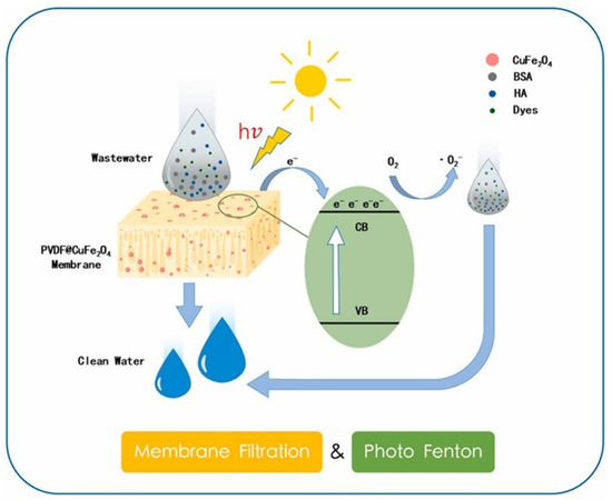 Membrane separation offers many advantages in wastewater treatment, including high efficiency, low energy consumption, and ease of operation [71]. However, membrane fouling always lowers the separation efficiency and shortens the membrane life, which greatly hinders the application of membrane technology. For this reason, Wang et al. [72] combined photo–Fenton and membrane processes for water treatment (Figure 3). These authors synthesized CuFe2O4 particles and doped them into the PVDF@CuFe2O4 membranes. The photo–Fenton process can degrade various foulants through the generation of hydroxyl radicals, which improves the filtration performance of the membranes.