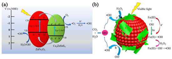 Wang et al. [84] used a p–n heterostructured nano–photocatalyst based on the p–type Cu2ZnSnS4 (CZTS) nanosheets, which were successfully assembled on the surface of ZnFe2O4 (ZFO) nanospheres, forming CZTS/ZFO p–n heterostructures. These p–n heterostructures could not only efficiently expand the spectral response and promote photo–induced charge separation, but also increase the specific surface areas for photocatalytic and photo–Fenton reactions. All these factors resulted in the p–n hetero–structured CZTS/ZFO nano–photocatalyst with significantly enhanced photocatalytic activity for the degradation of MO in the presence of H2O2 with visible light irradiation, compared to pure ZFO. This behavior was due to the synergistic enhancement effects of the CZTS/ZFO p–n heterostructure combined with the photo–Fenton mechanism. (Figure 4).