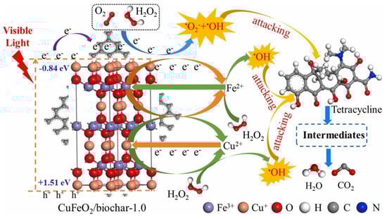 Xin et al. [38] synthesized CuFeO2/biochar composites for heterogeneous photo–Fenton–like processes (HPF–like) via the hydrothermal method. Biochar prevented agglomeration and avoided the usage of added reductants. Moreover, the introduction of biochar had several advantages, such as enhancing visible–light absorption, narrowing the bandgap of CuFeO2, and partially suppressing the recombination between photoelectron and hole pairs. By applying the design of experiments and the surface response methodology the authors studied the effects of the operating conditions on TC degradation efficiency. The results showed that the optimum parameters were 220 mg L−1 of catalysts, 22 mM of H2O2, and pH 6.4, with a pH dependence relatively gentle in the range of 4.0 to 8.0. Under optimal conditions, the efficiency of TC degradation in HPF–like systems was 96.7% after 120 min of treatment. Furthermore, the catalyst exhibited excellent stability since the activity only decreased by 3.9% after five utilization cycles and the total dissolved concentrations of both iron and copper ions at 120 min were below 0.02 mg L−1. Active species scavenging experiments were carried out by using p–benzoquinone, silver nitrate, methyl alcohol, and ammonium oxalate as the scavengers of O2•−, photoelectrons, HO•, and photogenerated holes, respectively. Interestingly, ammonium oxalate did not decrease the catalytic performance but accelerated the TC degradation rate. The latter effect was attributed to a lower photoelectron quenching rate, which could promote Fe3+/Fe2+ and Cu2+/Cu+ cycles, thus significantly improving H2O2 activation. In addition, ESR experiments allowed the identification of HO• as the predominant active species, whereas photoelectrons and O2•−, were auxiliary species for TC degradation. The mechanistic findings are schematically summarized in Figure 5.