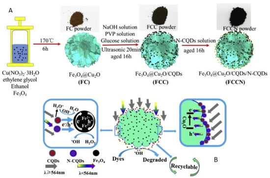 Zhang et al. [102] used Fe3O4@Cu2O/carbon quantum dots (CQDs)/nitrogen–doped carbon quantum dots (N–CQDs) (FCCN) for the degradation of azo compounds, such as MO, acid orange II, and mordant yellow 10, even at a neutral and alkaline pH (pH: 7–12) with a shortest time for complete degradation of 15 min. There is a cooperative interaction between each component, so the synergism from all the components of FCCN enhances the photocatalytic properties. The authors proposed a mechanism where in the first place, the up–conversion characteristics of CQDs and N–CQDs improve the light utilization of FCCN. Secondly, the load of CQDs and N–CQDs can separate and transfer photo–generated charges between Fe3O4 and Cu2O more efficiently, accelerating the circulation of Fe3+/Fe2+ for the decomposition of H2O2 to yield the active species: HO• radical. Thirdly, the light–induced protons of CQDs change the partial pH, so that the FCCN system is able to work in alkaline solutions. Finally, the insoluble layers of CQDs and N–CQDs are beneficial to enhance the stability of the composite (see in Figure 7 the schematic diagram of the catalytic mechanism proposed by the authors). The magnetism of Fe3O4 made this catalyst easily separable and the insoluble layers of CQDs and N–CQDs allowed it to be repeatedly used without activity change even after 10 cycles. The degradation rate constant of MO in the FCCN/H2O2/light system was 5.4 times higher than that of the Fe3O4@Cu2O/H2O2/light system, indicating that the loaded quantum dots greatly enhanced the photocatalytic activity. The degradation rate constant in the FCCN/H2O2/light system was 2.5 times higher than that of the simple mixture (Fe3O4@Cu2O + CQDs + N–CQDs)/H2O2/light system, which suggests that these excellent catalytic performances should come from the synergism effect of all components in FCCN.