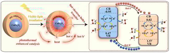 Shi et al. [111] prepared a binary bimetallic heterojunction, which consisted of a core–shell magnetic CuFe2O4@MIL–100(Fe, Cu) metal–organic framework, via an in–situ derivation strategy. The synthesis methods, which involved the in situ surface pyrolysis of CuFe2O4 nanoparticles and complexation with trimesic acid to derive MIL–100(Fe, Cu), allowed the formation of a bimetallic core–shell CuFe2O4@MIL–100(Fe, Cu) heterojunction (MCuFe MOF). A schematic diagram of the synthesis process of MCuFe MOF is shown in Figure 8. These materials showed notable catalytic performance in a photo–Fenton process towards the degradation of various organic pollutants by increasing H2O2 activation efficiency and decreasing the required dosage of MCuFe MOF (0.05 g L−1) over a wide pH range (4–9) (Table 4). Furthermore, the MCuFe MOF showed a high stability for the degradation of organic contaminants, with almost no decrease in activity and negligible metal leaching after five successive cycles. According to the proposed mechanism, the combination of the photothermal conversion effect with the formed heterojunction cannot only accelerate the generation and separation of photogenerated e− and h+ but also improve the continuous and efficient transformation of ≡Fe(III)/Fe(II) and ≡Cu(II)/Cu(I) redox couples, leading to enhanced photo–Fenton efficiency (see Figure 9).