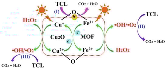 Zhong et al. [112] performed Cu2O growth on the surface of Cu–doped MIL–100 (Fe) to obtain a Cu2O/MIL(Fe/Cu) composite, which showed an enhanced interfacial synergistic effect and was successfully used as photo–Fenton catalysts for thiacloprid (TCL) degradation. The authors reported that Cu doping into MIL(Fe) led to the reduction in the band gap, and a boost of the redox cycle Fe2+/Fe3+. Likewise, the growth of Cu2O extended the light absorption range of MIL(Fe/Cu) from UV to the visible region. A proposed TCL degradation mechanism is shown in Figure 10. Cu2O/MIL(Fe/Cu) composite exhibited a TCL degradation rate nearly 10 times faster than those of Cu2O and MIL–100(Fe), separately, achieving a complete TCL degradation within 20 min of reaction. Moreover, TOC removal reached 82.3% within 80 min under neutral conditions, which highlights the good performance of the Cu2O/MIL(Fe/Cu) composite. Catalyst reuse tests showed no significant efficiency loss in reaction rates even after the tenth cycle, reaching complete TCL degradation within 20 min in each cycle.