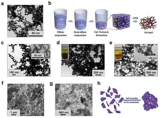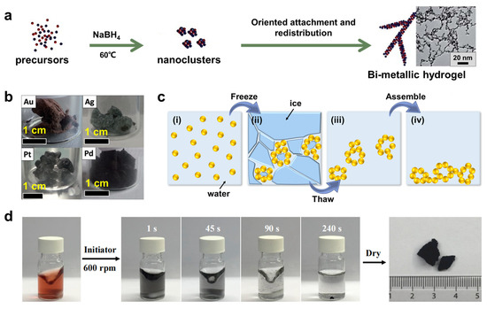 Although the two-step strategy is advantageous in shaping multiscale structures, it often suffers from high costs and tedious operation. Therefore, the one-step strategy offers a feasible solution. In 2013, a one-step strategy was proposed by Liu and co-workers [35]. Briefly, Pd, Pt, and Pt-Pd gels were obtained from dilute metal salt aqueous solutions after 3–17 days by applying 1.5 equivalents of NaBH4 (Figure 1g). This strategy merges the metal NP formation and the gelation into one step by only applying appropriate reductants, thus considerably simplifying the operation and reducing contamination. Obviously, the core of the one-step strategy lies in the rational selection of the type and the amount of reductants and also provides a comprehensive understanding of the roles played by the reductants in specific scenarios.