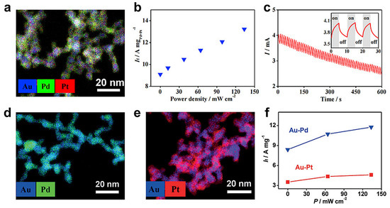 In addition to conventional electrocatalysis, MAs have been recently explored as a photoelectrocatalysis (PEC) platform by utilizing the combined optic and catalytic activities endowed by nanostructured metals. This endeavor was pioneered in 2020 by our group, where the photocatalytic performance for EOR was evaluated with an Au-Pd-Pt aerogel under a white-light LED source (wavelength range of 350–800 nm) (Figure 4a) [22]. As seen from Figure 4b, If of the Au-Pd-Pt aerogel raises stepwise from 9.1 to 13.2 A mgPd+Pt−1 as the light power density increases from 0 to 133 mW cm−2, which are 5.0 to 7.3 times higher than that of commercial Pd/C in the dark. This light-enhanced performance may be attributed to both the plasmonic absorption of nanostructured noble metals, as well as the photothermal effect from multiple light absorption/scattering inside the gel network. Interestingly, this property may also find applications in sensing. As shown in Figure 4c, switching on/off the light during a chronoamperometry test results in repeated current fluctuations, manifesting a sensitivity of >40.2 μA mW−1. A follow-up study explored PEC for EOR by using hierarchically structured Au-Pd and Au-Pt aerogels (Figure 4d–f) [67]. Similarly, a ~40% improvement in If was observed with an Au-Pd aerogel under irradiation compared with that in the dark (11.8 vs. 8.4 A mg−1), both considerably outperforming that for commercial Pd/C (1.8 A mg−1 in the dark).