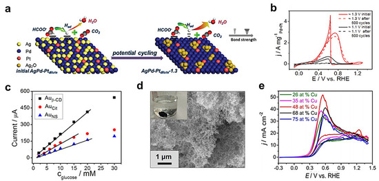 FOR has also drawn substantial interest in recent years on account of the high energy density and security of formic acid/formate [77]. MAs have also been applied for electrocatalyzing FOR [47,50,78,79,80,81]. In 2018, a Pd-Cu aerogel was reported for efficiently catalyzing formic acid oxidation [50]. In a 0.5 M H2SO4 and 0.5 M HCOOH solution, the Pd-Cu aerogel displayed a high current density of 3.13 A mgPd−1, which nearly doubled that of Pd/C (1.67 A mgPd−1). This improved performance can be attributed to the self-supported nature of aerogels, which eliminates the potential carbon substrate corrosion that happens in commercial Pd/C. Recently, an in situ high-potential-driven restructuring strategy was proposed to promote electrocatalytic HCOOK oxidation in alkaline media [80]. As schemed in Figure 5a, the potential cycling of a ternary Ag-Pd-Pt aerogel leads to an outward diffusion of Ag and thus generates amorphous Ag2O-coupled Pd-Pt on the surface. This architecture can weaken the chemisorption of Had intermediate because of the lowered d-band center, thus promoting FOR. By cycling Ag-Pd-Pt aerogels between 0.1 V and 1.3 V, the resulting materials exhibit outstanding activity (5 times higher than that for Pd/C) and stability (Figure 5b).